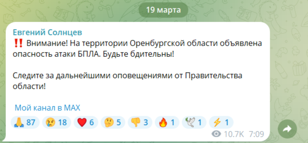 Утром 19 марта в Оренбургской области вновь объявили об угрозе атаки беспилотных летательных аппаратов. Оповещение опубликовал в своем телеграм-канале губернатор региона Евгений Солнцев в 07:09.