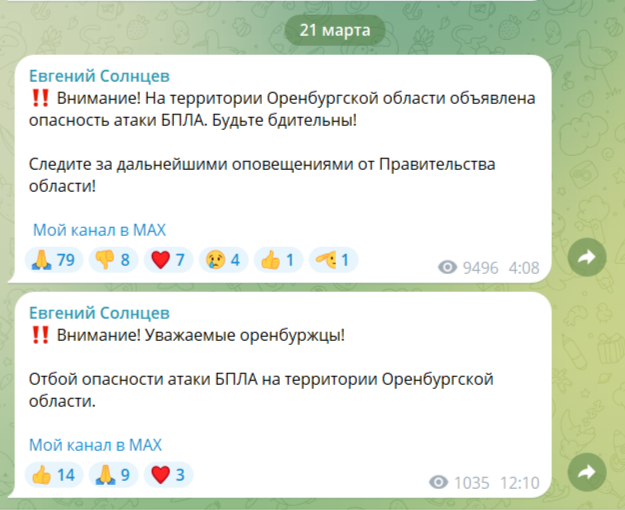 21 марта в Оренбургской области в очередной раз была объявлена опасность атаки беспилотных летательных аппаратов. Губернатор Евгений Солнцев сообщил об этом в своём Telegram-канале в 04:09.