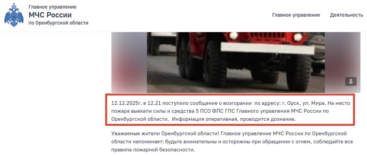 12 декабря в первой половине дня орчане заметили мощный столб черного дыма над одним из районов города. Вскоре на проспекте Мира появились пожарные машины.