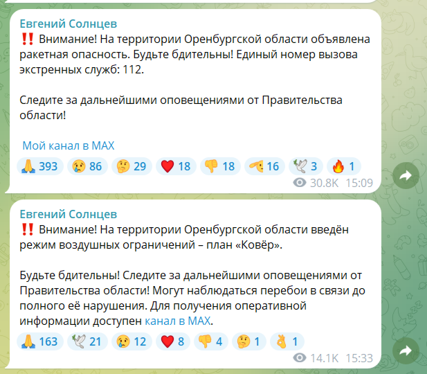 27 февраля в 15:09 в Оренбургской области впервые объявили о ракетной опасности. Ранее в регионе уже объявлялась воздушная тревога, но чаще всего вводились план «Ковер» и режим угрозы атак беспилотников. В настоящее время аэропорт Оренбурга закрыт.