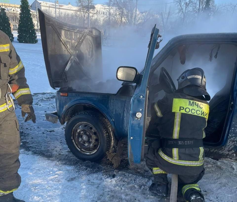 Возгорание автомобиля марки «Нива» произошло в понедельник у памятника Ленину, рядом со зданием Агропрома.