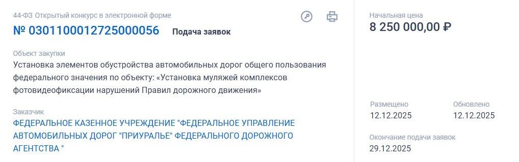 ФКУ Упрдор «Приуралье» разместило на портале Госзакупок тендер на монтаж конструкций, имитирующих камеры фотовидеофиксации. Подача заявок возможна до 29 декабря 2025 года.